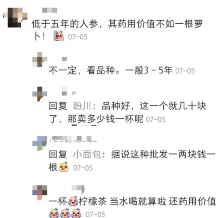 也有清醒的消費者,“低于五年的人參,其藥用價值不如一根蘿卜!”、“據(jù)說這種批發(fā)一兩塊一根”。