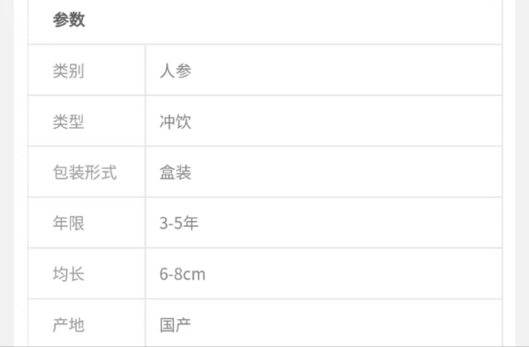 他們的產(chǎn)品簡介也顯示,“一整根”的參齡在3-5年,尺寸在6-8cm。