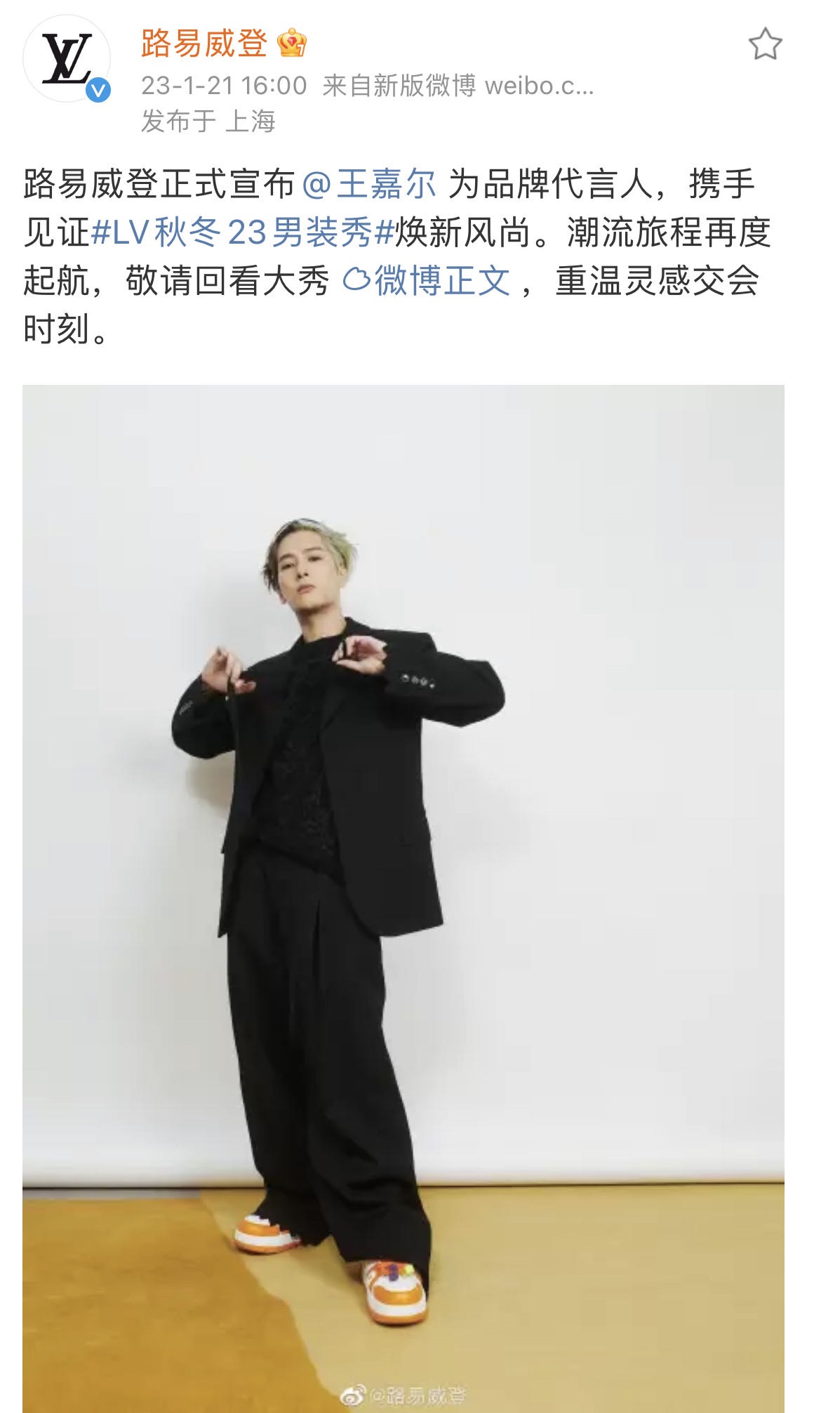 繼官宣王鶴棣為全新品牌大使后,日前,Louis Vuitton在官方社交媒體宣布王嘉爾為品牌代言人。