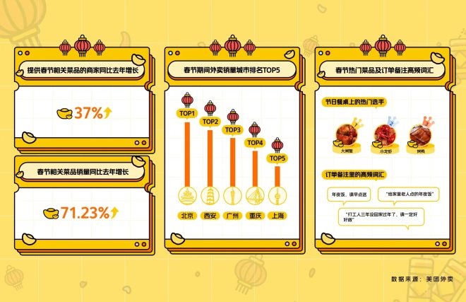 美團(tuán)外賣數(shù)據(jù)顯示,今年春節(jié)假期期間,提供春節(jié)相關(guān)菜品的商家同比去年增長了37%,春節(jié)相關(guān)菜品銷量同比去年增長了71.23%。