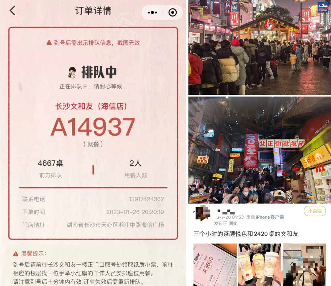 熱門旅游城市長(zhǎng)沙的餐飲打卡標(biāo)志,文和友和茶顏悅色雙雙登上了熱搜。前者在春節(jié)期間締造了排位超過4600桌的夸張景象,后者喝一杯至少要排位等三小時(shí)。