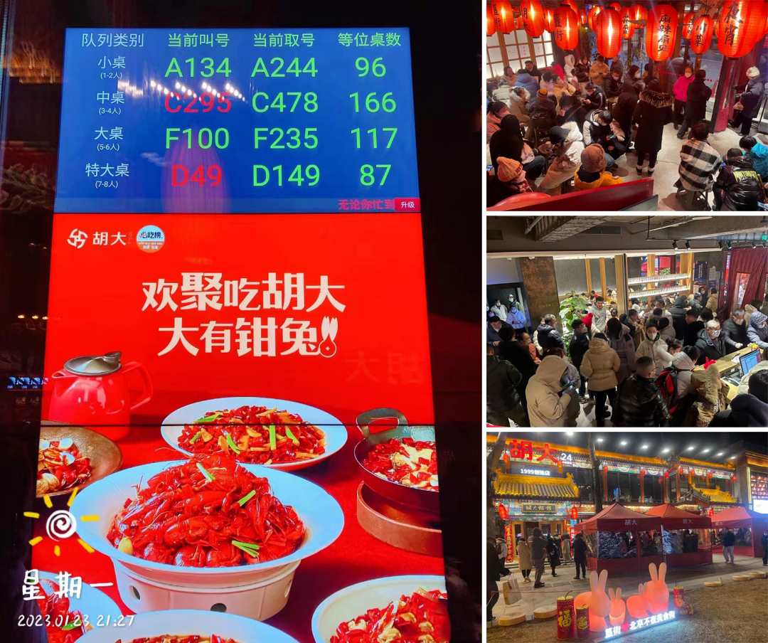 而簋街胡大飯館,也打出了“歡聚吃胡大,大有鉗兔”的口號(hào),龍蝦+兔年進(jìn)行了巧妙的結(jié)合。門口的紅帳篷一支棱,里面擠滿了拿號(hào)等候的顧客。負(fù)責(zé)人告訴內(nèi)參君:初一至初五,累計(jì)接待客流24000余人次,同比去年?duì)I業(yè)收入增長(zhǎng)65%,客流增長(zhǎng)86%;初四和初五當(dāng)天排隊(duì)等位突破2400+桌,11:30開始排隊(duì)持續(xù)至凌晨?jī)牲c(diǎn)半;而小龍蝦在這個(gè)春節(jié)檔共賣掉了6500斤。