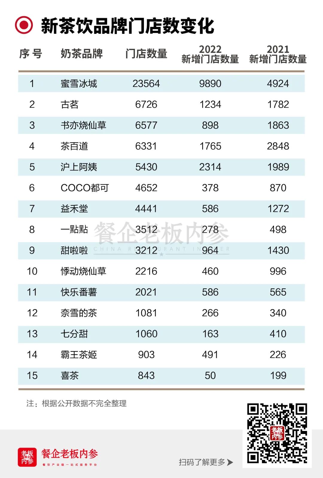 除了蜜雪冰城之外,過去的兩年里中腰部品牌也“殺瘋了”。2021年有6個品牌的新增門店超過千家,2022年即便受到疫情的嚴(yán)重影響,滬上阿姨、茶百道和古茗也還保持了“一年千店”的增長。