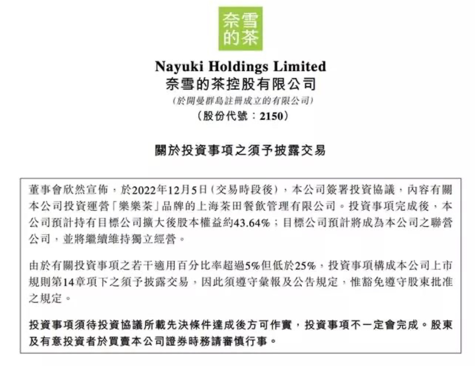 -12月5日,奈雪的茶以5.25億元收購樂樂茶43.64%的股權(quán),成為其第一大股東。創(chuàng)造了今年新茶飲最大的一筆投資;