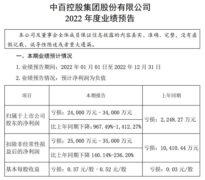 中百集團(tuán)預(yù)計(jì),2022年歸屬上市公司股東的凈利潤(rùn)為-2.4億元至-3.4億元,同比下降967.49%-1412.27%;扣除非經(jīng)常性損益后的凈利潤(rùn)為-2.5億元至-3.5億元,同比下降140.14%-236.20%。