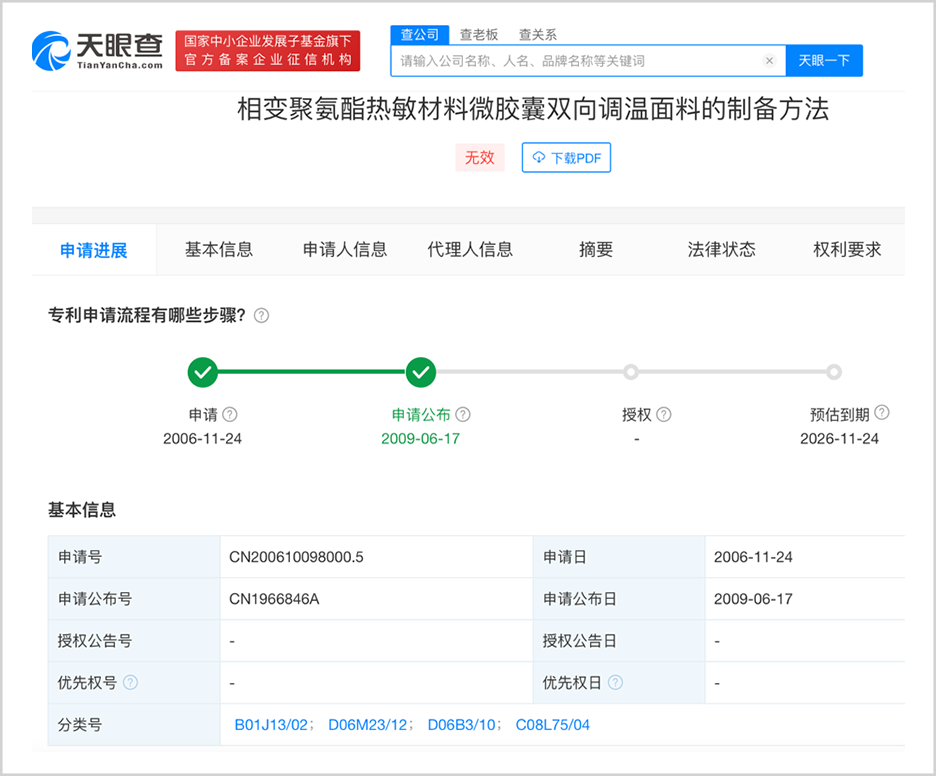 天眼查顯示,2006年,一種雙面調(diào)溫面料的技術專利技術就已經(jīng)在申請專利之中,資料顯示,其生產(chǎn)難度小。