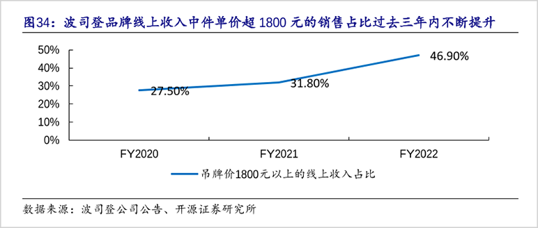 開源證券研報顯示,波司登線上1800元以上的羽絨服占比由2020年的27.5%上升到2022年的46.9%!拔磥聿ㄋ镜怯鸾q服價格還將持續(xù)上漲,均價會達到2000元以上!辈ㄋ镜瞧放剖聵I(yè)部總裁芮勁松曾公開說道。