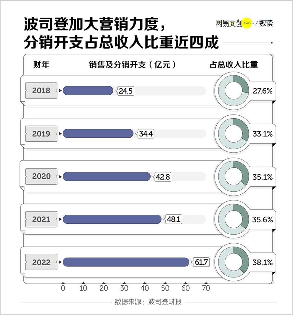 2018-2022財年,波司登銷售分銷開支上漲了1.5倍,占營收比例從27.6%上升到38.1%,接近4成。