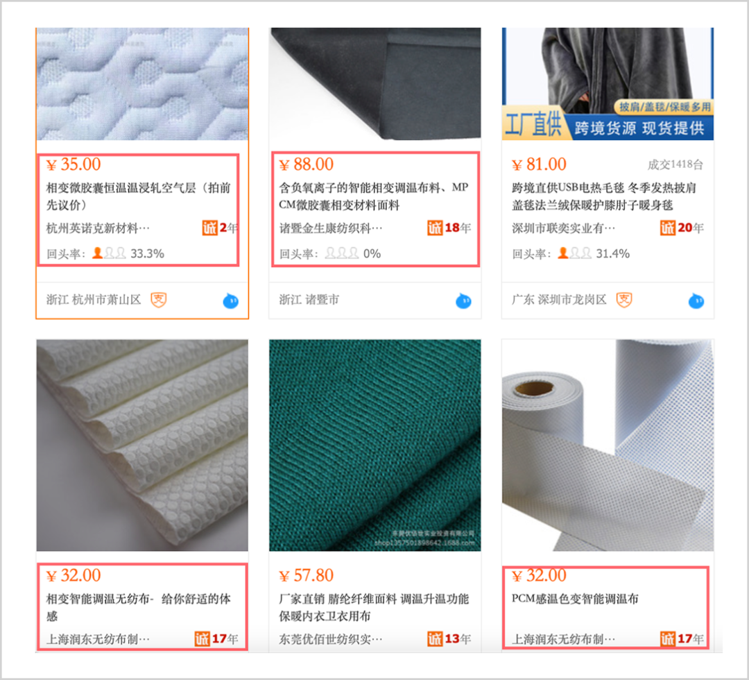 在阿里巴巴1688平臺,多家企業(yè)都在批發(fā)這種技術的面料。杭州英諾克已發(fā)起申請了多項專利,該公司售賣的PCM變相材料最貴的為450元/千克,面料價格僅35-60元/米,價格低廉。