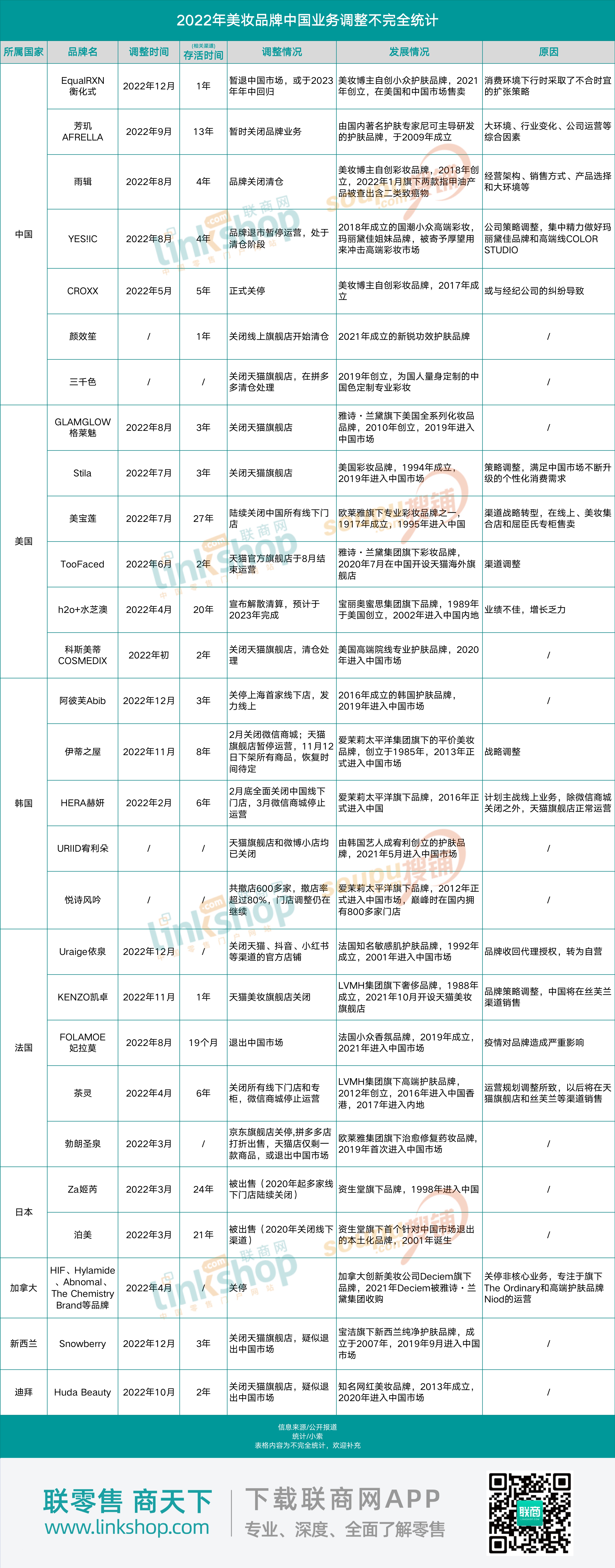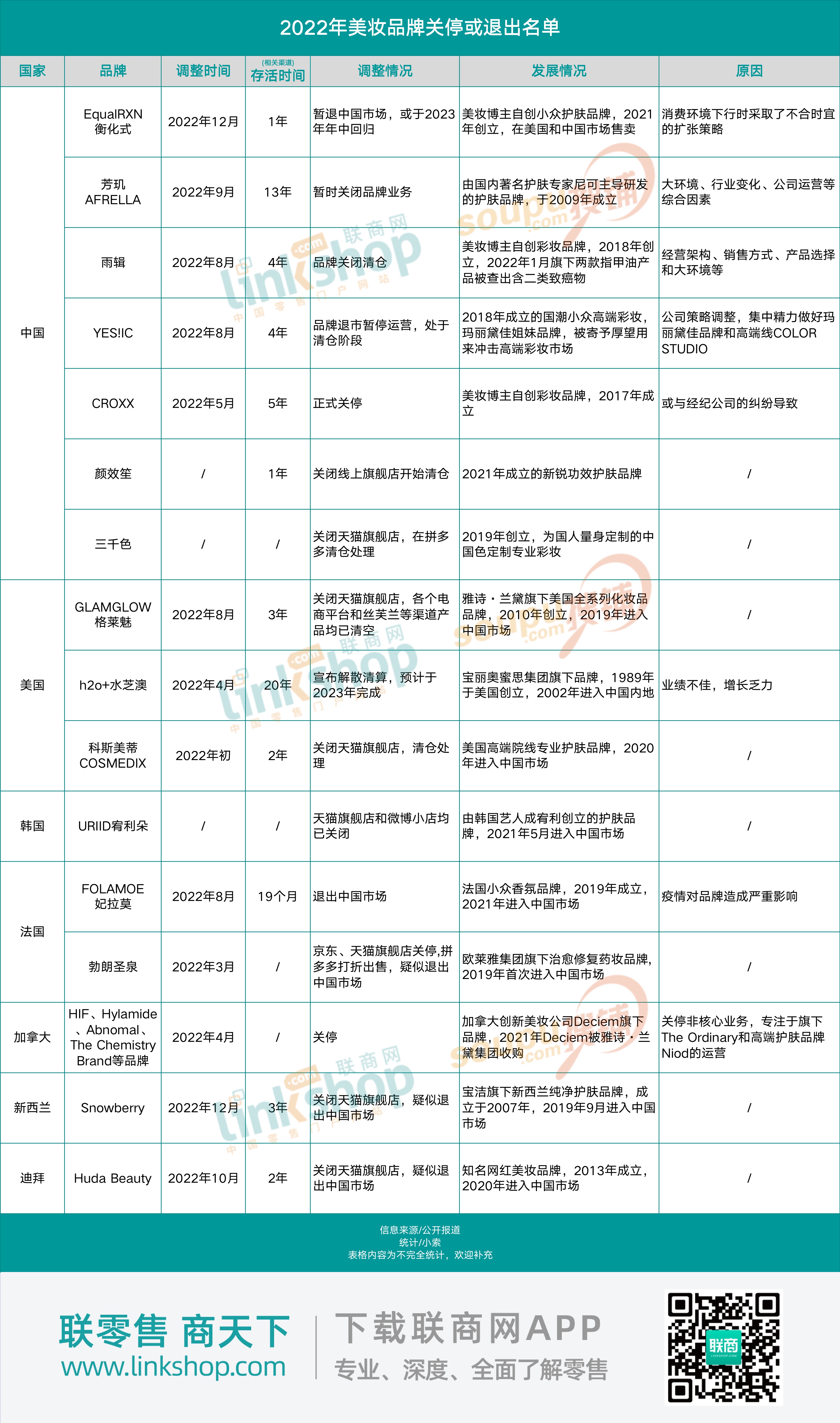 值得注意的是,2022年,共有13個美妝品牌明確表示關(guān)停或退出中國市場,3個品牌疑似告別。