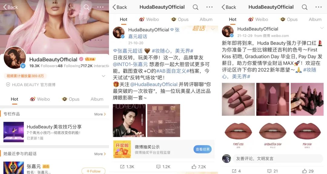 但很少有網(wǎng)紅品牌會與中國明星或KOL合作,即便是有合作,對品牌營銷所產(chǎn)生的效果也比較微弱。Huda Beauty算是少數(shù)請了明星代言的海外網(wǎng)紅品牌之一,該品牌2020年進入中國,直到2021年10月才官宣了中國區(qū)首位品牌摯友為男團INTO1中的張嘉元。在官宣與張嘉元的合作之后,Huda Beauty隨后發(fā)布的多條與之相關(guān)的微博內(nèi)容流量暴增。