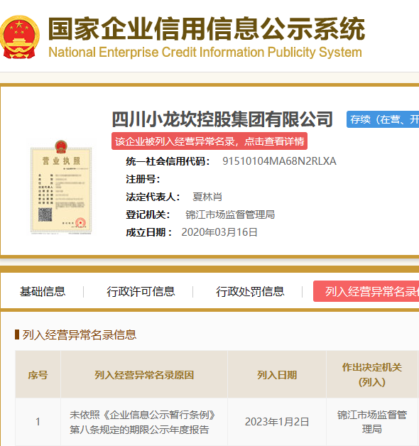 據(jù)國家企業(yè)信用信息公示系統(tǒng)顯示,四川小龍坎控股集團有限公司日前因未按規(guī)定期限公示年度報告,被錦江市場監(jiān)督管理局列入經(jīng)營異常名錄,列入日期為2023年1月2日。