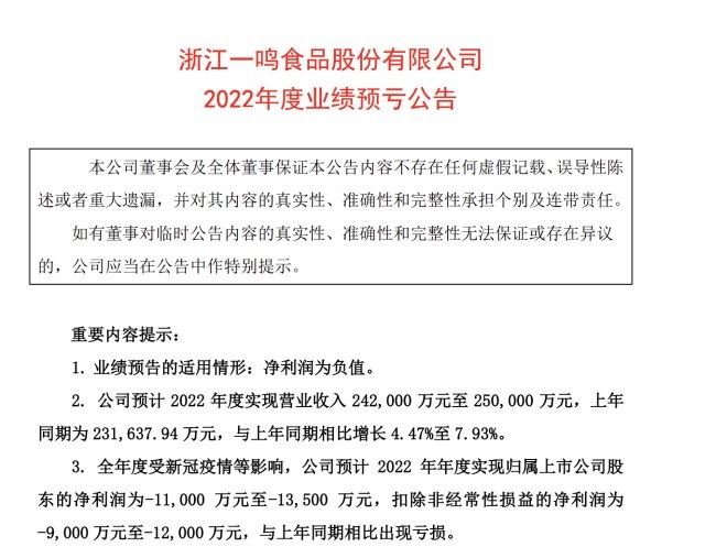 聯(lián)商快訊:近日,一鳴食品發(fā)布了2022年度業(yè)績預(yù)虧公告。