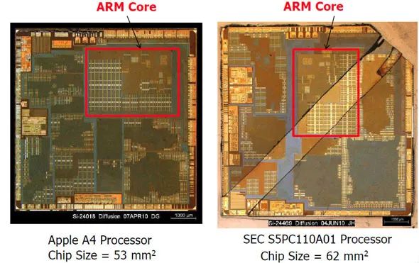蘋果自家的團(tuán)隊(duì)在A4上的貢獻(xiàn)其實(shí)并不大,A4大部分設(shè)計(jì)工作由三星和Intrinsity完成,跟三星的S5PC110芯片其實(shí)是同卵雙胞胎。因此,當(dāng)一些拆解機(jī)構(gòu)對A4的裸片進(jìn)行顯微拍照和紅外成像后,發(fā)現(xiàn)蘋果號稱的自研跟S5PC110內(nèi)核相同時,嘲諷鋪天蓋地襲來。