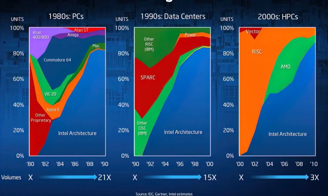這恐怕是半導(dǎo)體產(chǎn)業(yè)誕生以來最難啃的硬骨頭。如前文所述,Intel在誕生的半個世紀(jì)里縱橫捭闔,腳下全是挑戰(zhàn)者的尸骨。x86帝國不僅在PC機(jī)上接近壟斷,在服務(wù)器和高性能計(jì)算機(jī)(HPC)領(lǐng)域也把RISC陣營擠出市場。