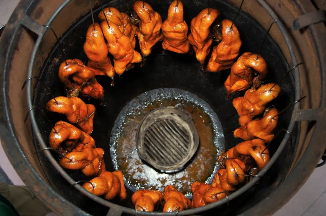 孫師傅在清宮掛爐烤鴨的基礎(chǔ)上將烤鴨技術(shù)進(jìn)行了進(jìn)一步改良,把原來(lái)的烤爐改為爐身高大、爐膛深廣、一爐可烤十幾只鴨的掛爐,還可以一面烤、一面向里面續(xù)鴨。