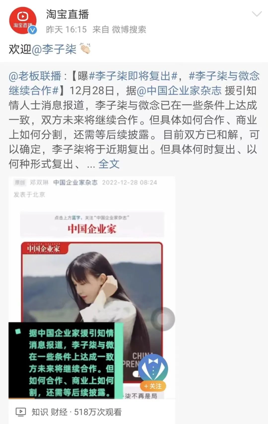 值得一提的是,淘寶直播微博賬號轉發(fā)了有關李子柒即將復出的新聞,并@李子柒表示歡迎,引發(fā)了人們對李子柒是否會入駐淘寶直播的猜測。