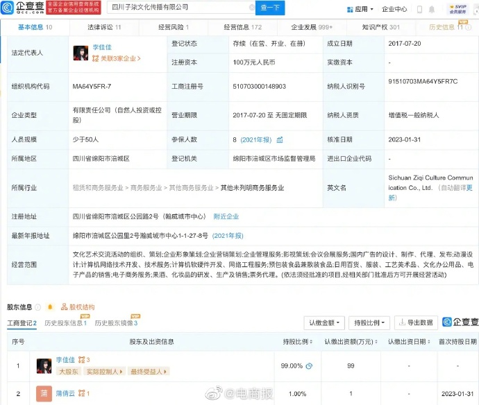 變更后,該公司由李子柒、蒲倩云分別持股99%、1%。
