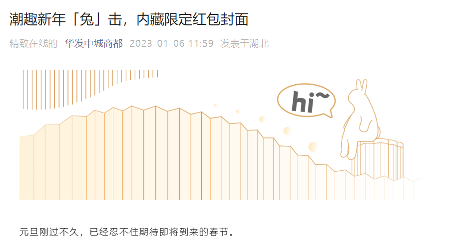 紅包鏈接或二維碼一般放置于推文末尾,推文內(nèi)容以新年活動(dòng)預(yù)告或營(yíng)業(yè)時(shí)間安排等信息為主,目的是以紅包封面這一福利形式,吸引大家讀完推文,提升信息傳達(dá)效率。