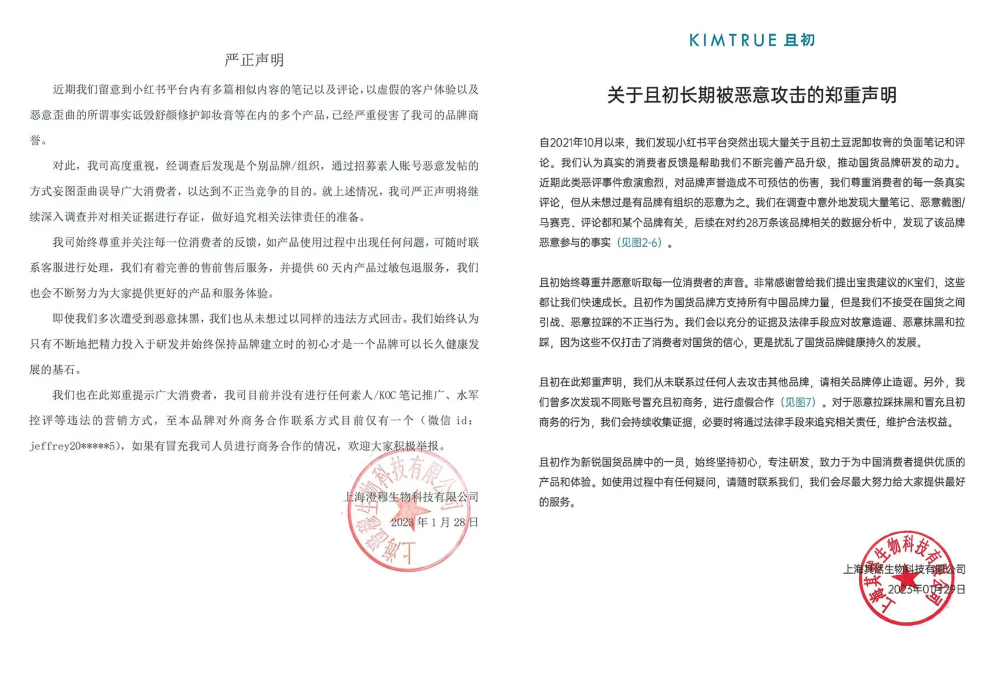 隨后1月29日下午3點(diǎn)且初發(fā)聲明反駁稱(chēng)相關(guān)品牌故意造謠。1、品牌從未聯(lián)系過(guò)任何人去攻擊其他品牌;2、平臺(tái)上惡意拉踩抹黑的賬號(hào)是并不是品牌行為,而是假冒的且初商務(wù);3、且初也發(fā)現(xiàn)近一年多時(shí)間中,小紅書(shū)平臺(tái)出現(xiàn)大量關(guān)于“且初土豆泥卸妝膏”的負(fù)評(píng),經(jīng)數(shù)據(jù)分析后發(fā)現(xiàn)是某個(gè)品牌惡意為之。同時(shí)也給出“證據(jù)”。