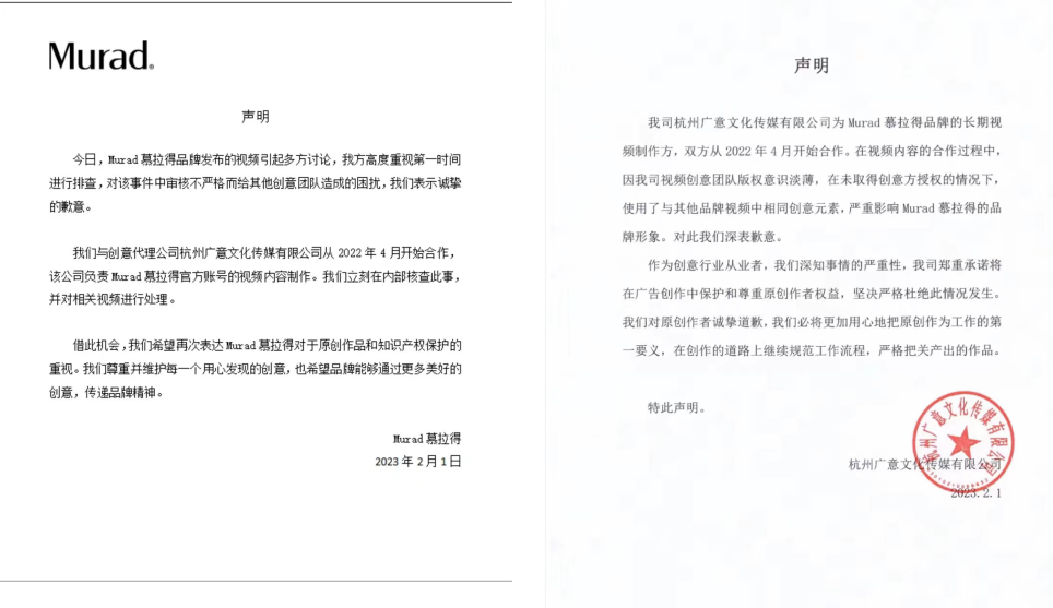隨后杭州廣意文化傳媒有限公司也發(fā)文表示對(duì)此負(fù)責(zé)。承認(rèn)其制作的Murad相關(guān)視頻確乃抄襲:“因我司視頻創(chuàng)意團(tuán)隊(duì)版權(quán)意識(shí)淡薄,在未取得創(chuàng)意方授權(quán)的情況下,使用了與其他品牌食品中相同創(chuàng)意元素,嚴(yán)重影響Murad慕拉得品牌形象!