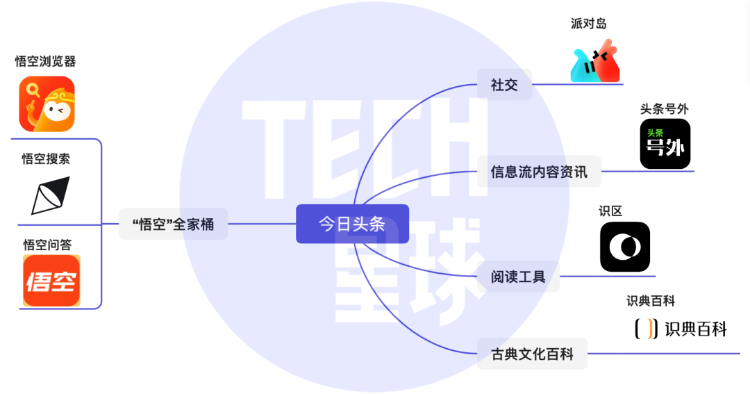 Tech星球梳理統(tǒng)計(jì)發(fā)現(xiàn),從2021年開始,今日頭條就在不斷探索新的業(yè)務(wù),不僅推出頭條號外、識區(qū)、識典百科等新式內(nèi)容產(chǎn)品,也跨領(lǐng)域地嘗試虛擬社交,并推出“派對島”產(chǎn)品,最重要的是孵化“悟空系”品牌,打造悟空瀏覽器、悟空搜索,以及未上線的悟空問答等內(nèi)容產(chǎn)品矩陣。