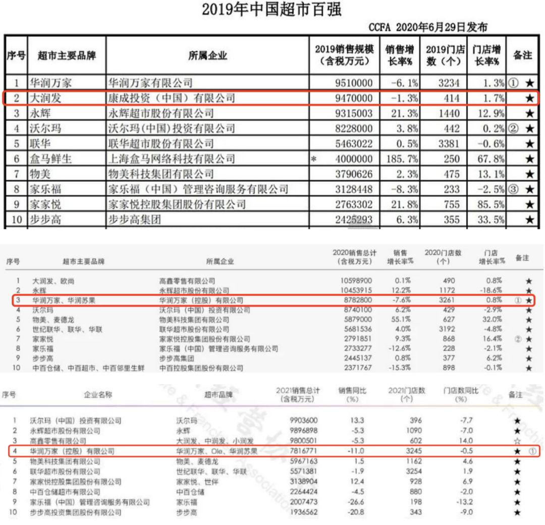 2019-2021年中國超市百強(qiáng)榜單 圖源:CCFA