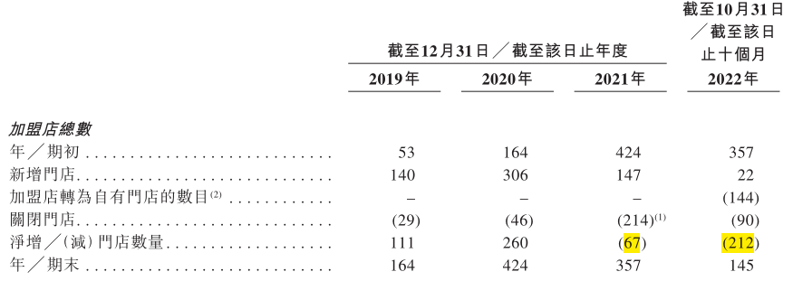 從2021年開始,KK的加盟商開始不斷流失,出現(xiàn)大規(guī)模閉店潮。2021年和2022年的10個月間,分別有20家和22家加盟商退出,加盟店數(shù)量分別減少67家和212家,主要來自KKV、調(diào)色師和KK館。原因是加盟店的業(yè)績未及預期,集團選擇關(guān)閉或?qū)⒉糠旨用说贽D(zhuǎn)為自有的全資門店。