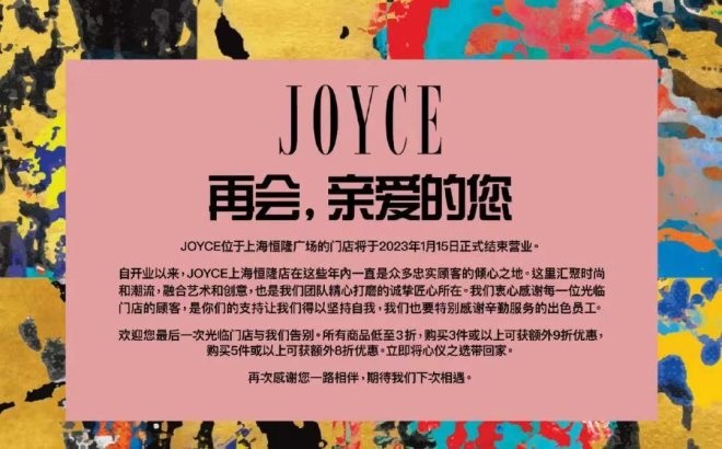 而在距離北京1300公里外的上海,告別了香港買手店鼻祖Joyce,2023年1月15日,Joyce上海恒隆廣場門店正式閉店,這也是其在內(nèi)地市場的最后一家獨立門店。
