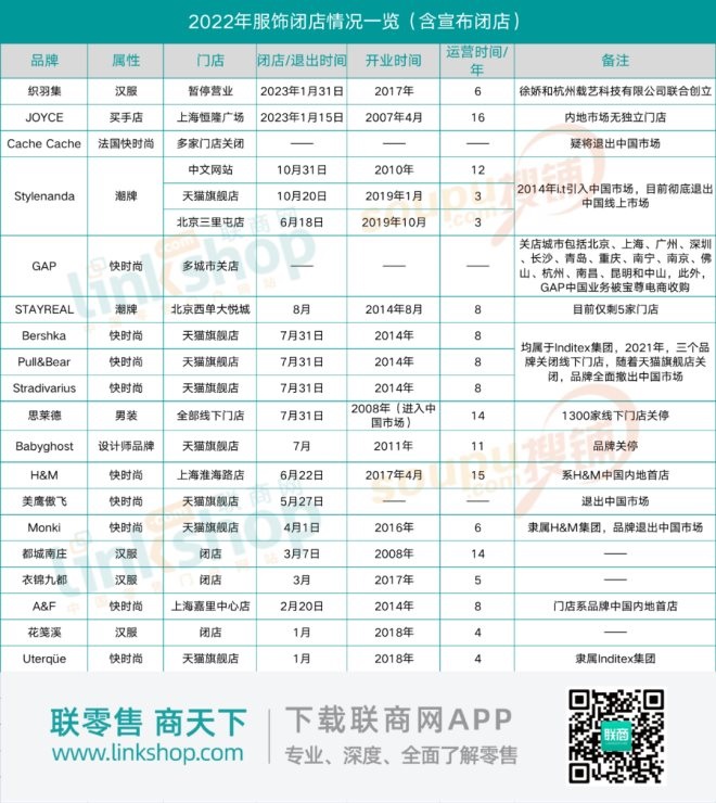 據(jù)《聯(lián)商網(wǎng)》不完全統(tǒng)計,2022年,超20家服飾企業(yè)宣布大量閉店、關(guān)停品牌或退出中國市場。