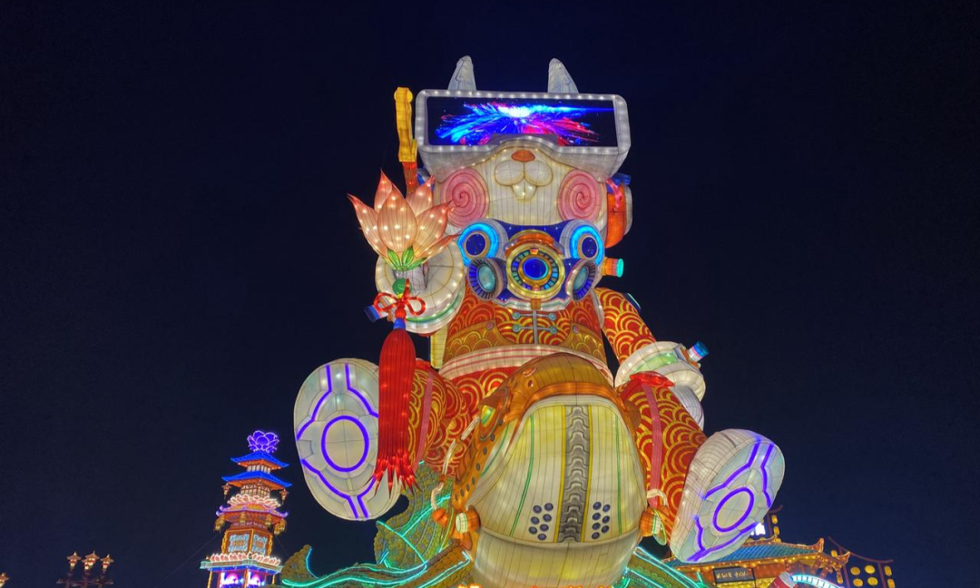 走進(jìn)自貢燈會(huì),首先映入眼簾的是一只“千燈萌兔”。它身穿超能機(jī)甲,頭戴元宇宙眼鏡,兩只長耳朵是信號接收器,一副酷炫的潮兔模樣,還不停轉(zhuǎn)頭望向進(jìn)門觀燈的游客,并舉手向大家致意。它坐在“賽博金魚”上,雙腳隨坐騎擺動(dòng),傳統(tǒng)中國風(fēng)與賽博朋克發(fā)生著完美的化學(xué)反應(yīng)。