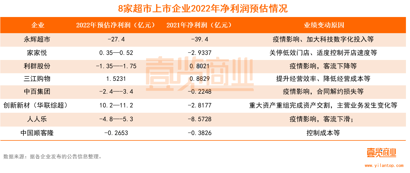 過去半個月,永輝、家家悅、王府井、新華百貨等33家商超、百貨上市企業(yè)陸續(xù)發(fā)布了2022年的業(yè)績預估報告。