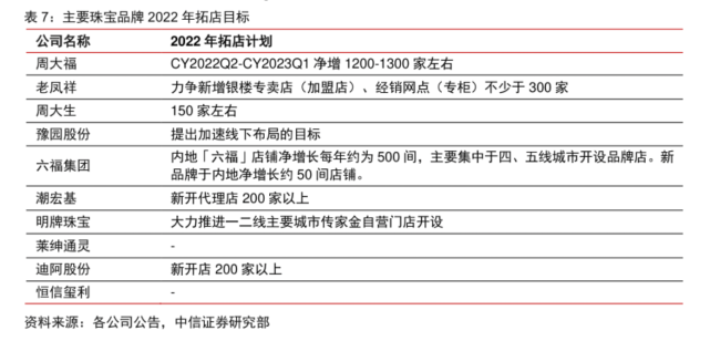 而對于珠寶零售商來說,業(yè)績的增長更多依賴于加盟門店數(shù)量的規(guī)模增長,拓店成為珠寶品牌競爭的重點。時代財經(jīng)注意到,周大福等珠寶品牌近年來正加快拓店速度,并深入下沉市場。據(jù)中信證券研報,周大福在2022年提出凈增1200-1300家門店的目標(biāo),而老鳳祥則新增不少于300家。