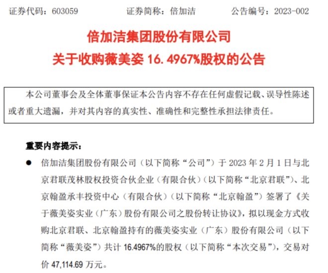 2月2日,口腔護(hù)理產(chǎn)品代工廠倍加潔集團(tuán)股份有限公司(下稱倍加潔)宣布擬收購薇美姿實業(yè)(廣東)股份有限公司(下稱薇美姿)16.4967%的股權(quán),交易對價4.71億元,創(chuàng)下2023年開年日化行業(yè)第一大收購案。