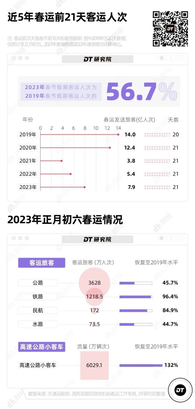 2023年正月初六返程高峰這一天,鐵路客運(yùn)人次已經(jīng)恢復(fù)至2019年同期96.4%的水平,民航客運(yùn)人次的恢復(fù)比例是84.9%。