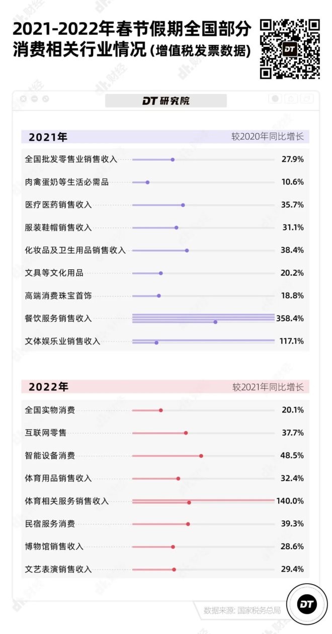 國(guó)家稅務(wù)總局最近幾年都會(huì)公布春節(jié)假期部分消費(fèi)相關(guān)行業(yè)增長(zhǎng)情況,依據(jù)是增值稅發(fā)票的數(shù)據(jù)——但因?yàn)槭恰安糠帧焙汀霸鲩L(zhǎng)”,每年放出來的行業(yè)不太一樣,沒法縱向拉通比較。