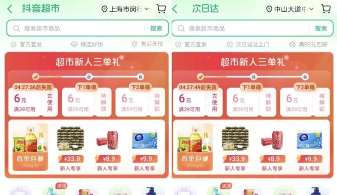 當(dāng)下,不管是天貓超市還是京東超市,都在APP首頁有直接的入口,但抖音超市只能通過搜索進(jìn)入,入口相對隱蔽;蛟S也說明,抖音超市對于自身的整體競爭力,是“知根知底”的。
