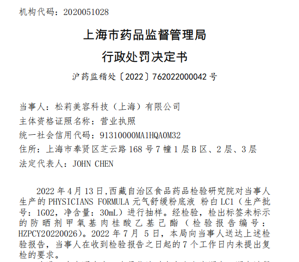 事實(shí)上,在今年1月通報(bào)的不合規(guī)產(chǎn)品的相關(guān)企業(yè)中,已有企業(yè)被處罰。譬如,1月29日被通報(bào)的產(chǎn)品標(biāo)識(shí)為PHYSICIANS FORMULA元?dú)馐婢彿鄣滓悍郯譒C1(標(biāo)識(shí)批號(hào)為1G02),該批次產(chǎn)品標(biāo)識(shí)的受托方為松莉美容科技(上海)有限公司(下稱:松莉公司),產(chǎn)品不合規(guī)原因系檢出標(biāo)簽未標(biāo)示的防曬劑甲氧基肉桂酸乙基己酯。