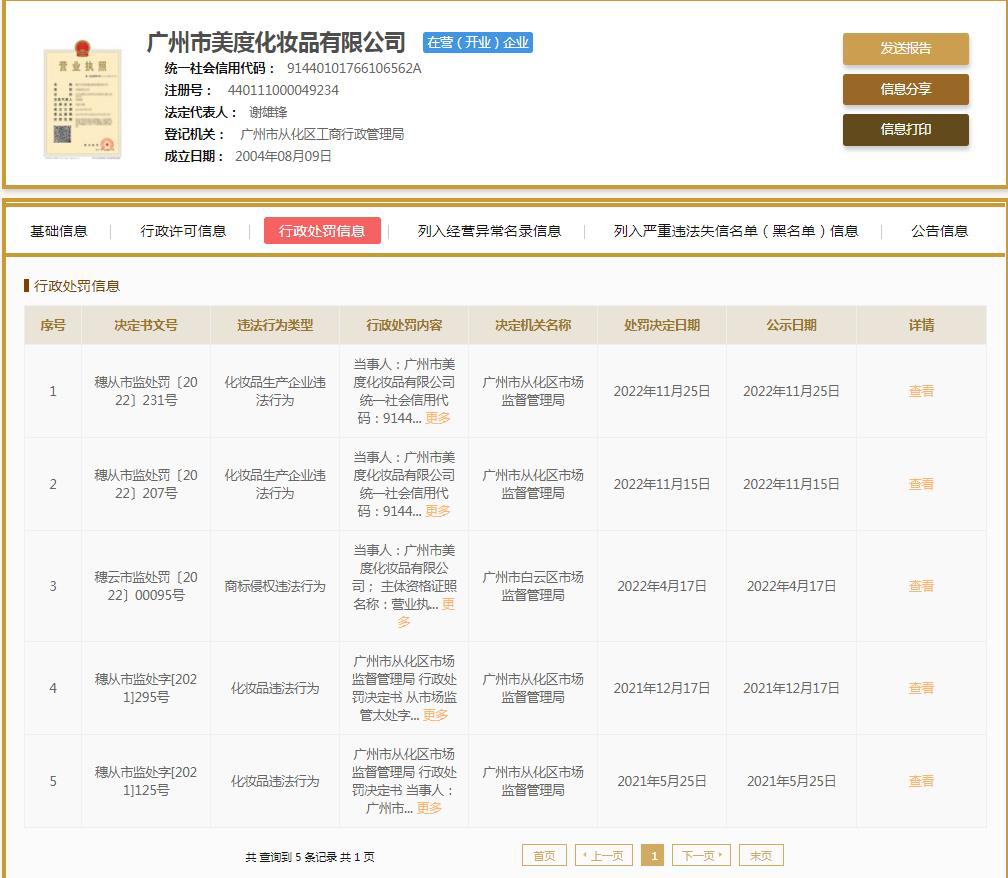 據(jù)國(guó)家企業(yè)信用信息公示系統(tǒng)發(fā)布的信息顯示,廣州美度在2021年至2022年兩年間,已先后5次被處罰。其中最近的一次即是2022年11月25日,該公司因涉嫌生產(chǎn)未經(jīng)注冊(cè)的特殊化妝品等違法行為,被廣州市從化區(qū)市場(chǎng)監(jiān)督管理局沒(méi)收批號(hào)為MDE091806002的美度MEIDU染發(fā)膏(咖啡色)894盒,沒(méi)收違法所得為480元并罰款8.5萬(wàn)元。