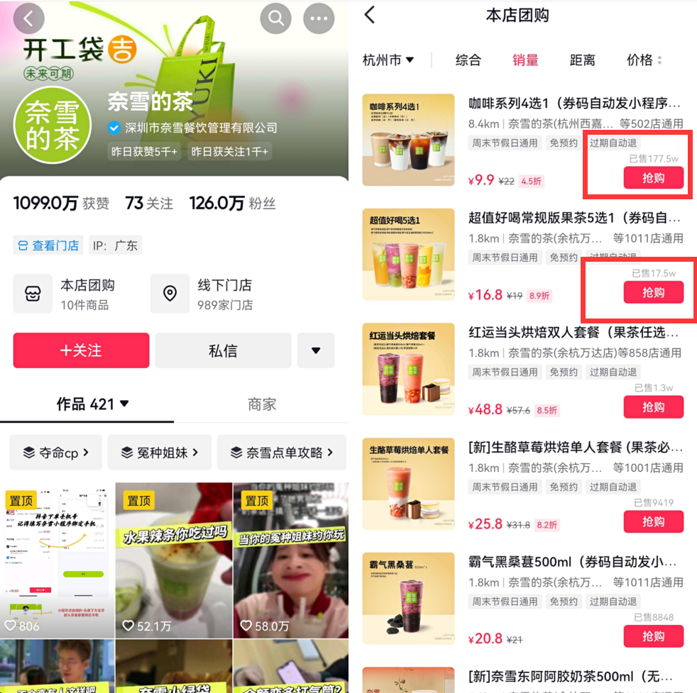一個(gè)很容易被人忽略的事件是,就在此后不久,抖音召開(kāi)了首屆新茶飲大會(huì),會(huì)上公布了一組數(shù)據(jù):2022年,平臺(tái)茶飲業(yè)務(wù)交易金額同比增長(zhǎng)了30多倍—記者留意到,在到店業(yè)務(wù)方面,渠道帶來(lái)的變化實(shí)際上也一定程度,帶動(dòng)了茶飲品牌的咖啡業(yè)務(wù)。比如,奈雪的茶在去年11月上線一款“9.9元四選一”的咖啡團(tuán)購(gòu)券,目前顯示已經(jīng)銷(xiāo)售超過(guò)177.5萬(wàn)件,甚至遠(yuǎn)高于其銷(xiāo)量排名第二的“16.8元五選一”的果茶團(tuán)購(gòu)券,后者顯示銷(xiāo)量17.5萬(wàn)件。