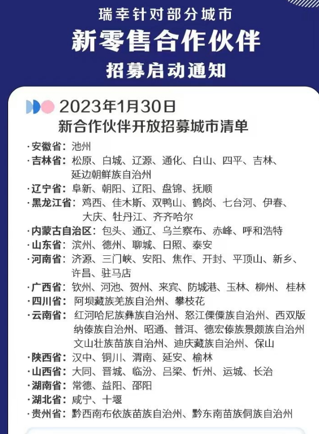 緊接著1月30日,瑞幸發(fā)布了新一輪的新零售合作伙伴招募計(jì)劃,涉及全國(guó)15省80個(gè)城市。此時(shí)距離上一次12月5日合作伙伴的招募,僅過(guò)去了不到兩個(gè)月。當(dāng)時(shí)的招募計(jì)劃面向安徽、河南、黑龍江、吉林、遼寧、內(nèi)蒙古、山東、山西、陜西9個(gè)省,共對(duì)41個(gè)城市開(kāi)放。而相較上一輪,瑞幸的最新招募范圍更為“下沉”,縣級(jí)城市出現(xiàn)頻率更高,新增欽州、佳木斯、松原、包頭、通遼、攀枝花、普洱、三門(mén)峽等33個(gè)城市。
