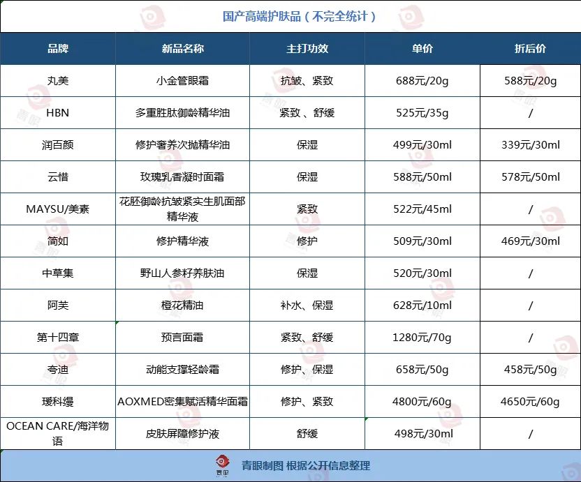 從品類來看,單價在500元左右的護膚品主要以精華類為主,面霜、眼霜等細分品類為輔!皩τ谕杳蓝裕瞥300-400元價位甚至500元價位的產(chǎn)品并非是一種嘗試,因為在國貨品牌里丸美一直是高端輕奢定位!蓖杳朗袌霾肯嚓P(guān)負責人告訴青眼。