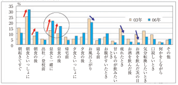 (從左至右,早晨起床、早餐時(shí)、早餐后、上班/上學(xué)前、午餐時(shí)、午餐后、回家前、晚餐時(shí)、晚餐后、洗澡后、睡覺(jué)前、饑餓時(shí)、想喝甜點(diǎn)時(shí)、疲勞時(shí)、酒后、酒后第二天、想轉(zhuǎn)換心情時(shí)、嘴巴寂寞時(shí)、做事時(shí)、其他)