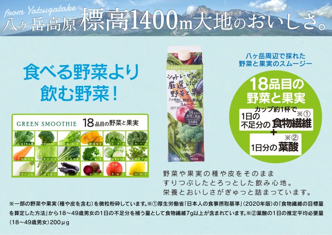 Chateraise推出的八岳周邊采摘的蔬果冰沙主打地理標(biāo)志原料,蘋果選擇的是山梨縣北斗市的津金蘋果,胡蘿卜產(chǎn)于八岳火山灰上的大冢,西蘭花來(lái)自山梨縣中央市田富地區(qū),小松菜產(chǎn)于山梨縣中央市田富地區(qū),向消費(fèi)者潛移默化輸出原料優(yōu)勢(shì)的形象。