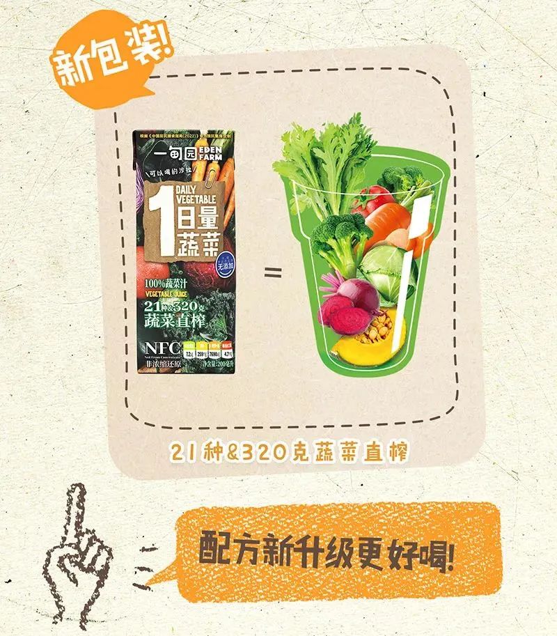 比如一甸園EdenFarm,自2020年成立之初就一直在探尋一種方便輕松的方式來(lái)幫助解決中國(guó)居民膳食蔬菜攝入不足的問(wèn)題,為消費(fèi)者構(gòu)建“蔬菜可以比你以為的更好喝,也比想象中的更重要”的消費(fèi)認(rèn)知,從發(fā)布第一款“100%零添加、健康、美味”的番茄汁飲品開(kāi)始,一直到現(xiàn)在的一日量蔬菜系列和蔬食生活系列,一直堅(jiān)持100%蔬菜汁、無(wú)添加、非濃縮還原。