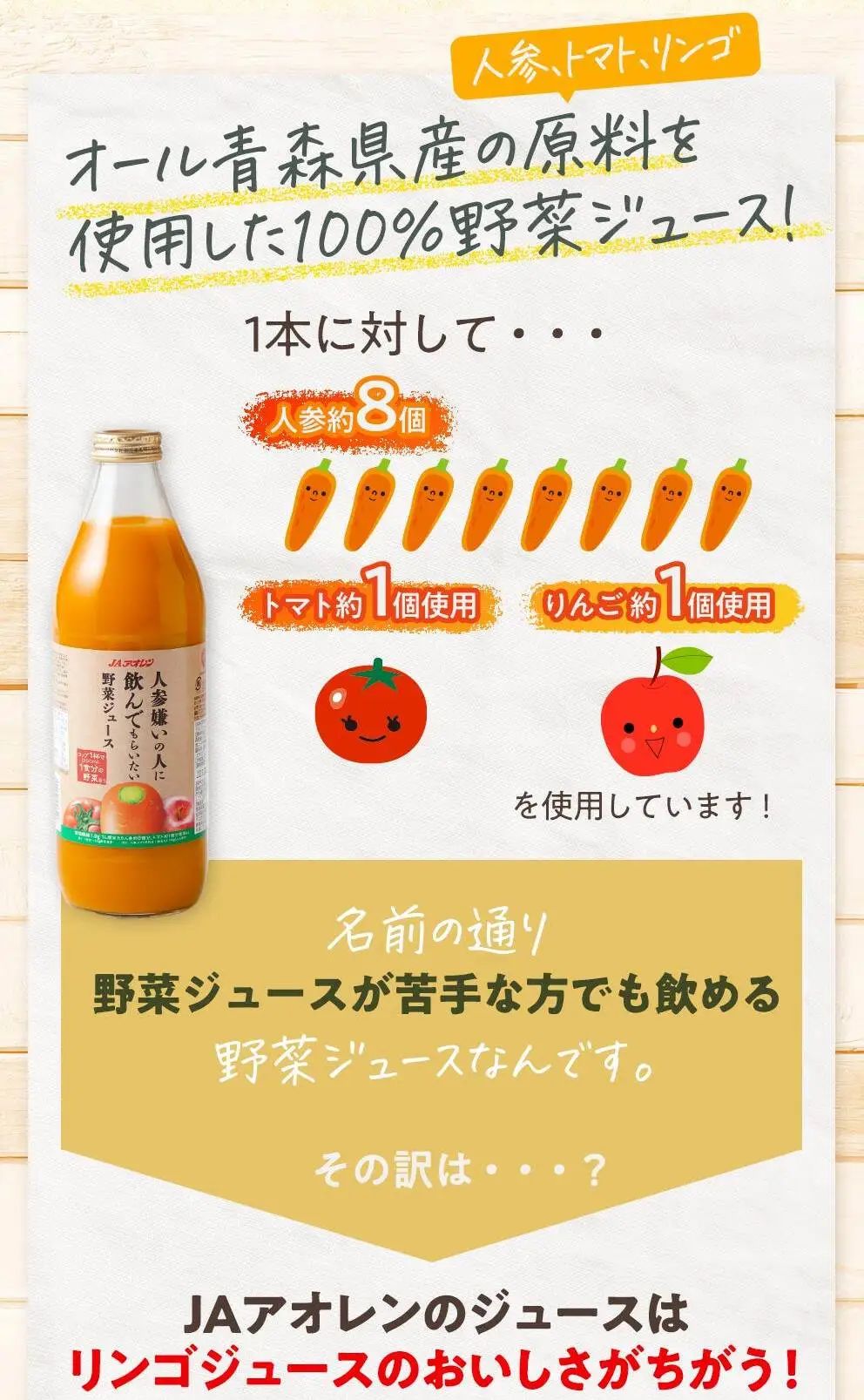 水果也是蔬菜汁的好CP。JAアオレン致力于打造一款專為不愛(ài)吃蔬菜特別是胡蘿卜的孩子開(kāi)發(fā)的蔬菜汁,由青森縣產(chǎn)的胡蘿卜、蘋果和西紅柿制成,添加了可感受的蘋果漿,平衡了胡蘿卜汁的特殊風(fēng)味。