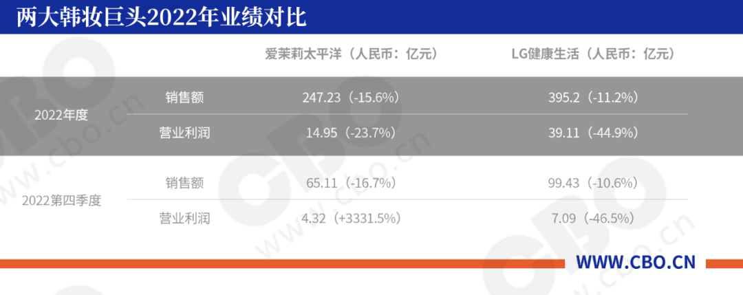 韓國兩大美妝集團LG生活健康、愛茉莉太平洋分別在1月31日、2月1日發(fā)表了集團2022年度財報和第四季度的銷售情況,兩者均大致呈現(xiàn)下降趨勢。