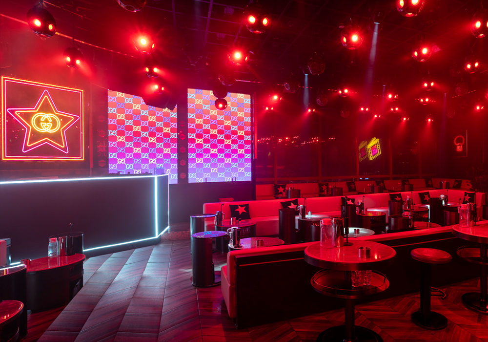 這個快閃店以好萊塢星光大道為設(shè)計靈感,以紅、黑高對撞配色為空間主色調(diào),塑造精致復(fù)古感。門店入口處放置有GUCCI LOVE PARADE的星星狀品牌裝置,并設(shè)置了GUCCI美陳裝置打卡區(qū)。店內(nèi)則在卡座區(qū)、DJ臺等多區(qū)域背景部分,應(yīng)用GUCCI的經(jīng)典GG老花元素進行場景布置,搭配迷幻的五彩燈光,氛圍感極強。