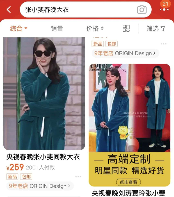 以今年的春晚為例,自晚8點開始,眾多明星的同款服裝悉數(shù)亮相登上熱搜,網(wǎng)友表示,“目不暇接,同款都要刷不過來了”。在春晚結(jié)束后,秦嵐同款綠色開衫、趙麗穎同款紅裙、楊紫同款大衣和同款女鞋,分列淘寶熱搜榜1-4位。