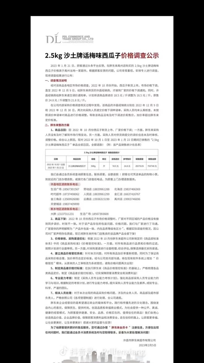 2、商品下架:2022年10月份西瓜子市場價格調(diào)整時,廠家對不同區(qū)域的產(chǎn)品價格沒有做到同步調(diào)價、時效不一致。對于該產(chǎn)品存在的包裝問題、價格問題,我們與廠家進行了溝通,廠家提供的聲明解釋為“產(chǎn)品外包裝一致、內(nèi)在品質(zhì)等級有區(qū)分”,根據(jù)實際調(diào)查情況,因公司對廠家的聲明存在質(zhì)疑,現(xiàn)已將胖東來所有門店售賣的該品牌產(chǎn)品全部下架!
